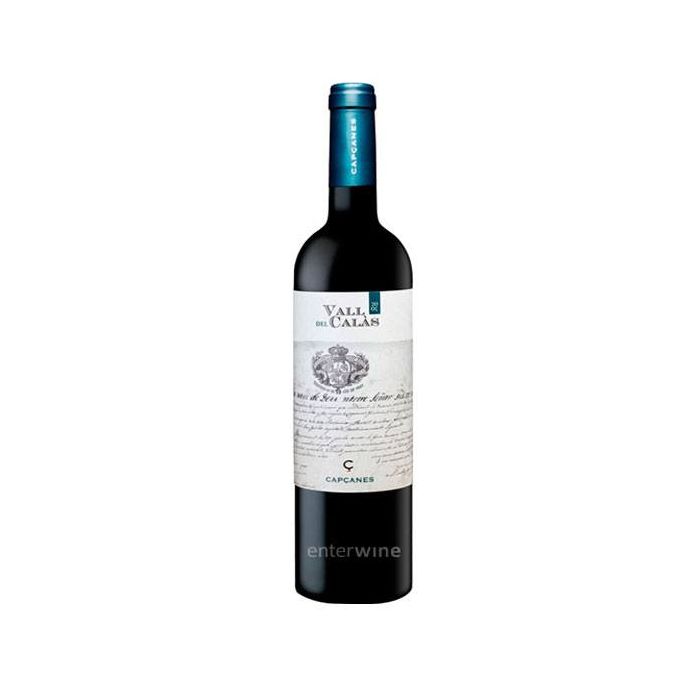 The red wine Vall del Calàs is made from an equal blend of Grenache and Carignan, sourced from organically certified vineyards with granite and clay soils, typical of the Montsant region.